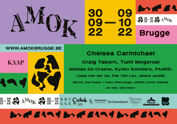 AMOK verovert dit najaar voor de vierde keer op rij de Brugse binnenstad. Van vrijdag 30 september tot en met zondag 9 oktober 2022 trakteert het allround-belevingsfestival van kunstencentrum KAAP op maar liefst tien bomvolle dagen cultuur. Op het programma staan heel wat verrassende concerten en muzikale releases die het dertigjarig bestaan van huislabel W.E.R.F. Records vieren, maar ook intieme slams, walks, verbindende brunches, luister-wandelingen, filmconcerten, dans en een onderwater-gig doen de culturele avonturier watertanden. Tijdens AMOK staat Belgisch talent zij aan zij met grote namen uit de internationale jazzscene, zoals Craig Taborn of Tumi Mogorosi, maar ook ook met revelaties als Alabaster DePlume en Chelsea Carmichael.